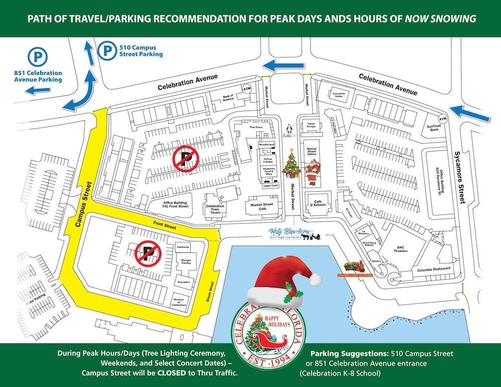 Beginning on Saturday, November 25th and continuing until December 31st is the Town of Celebration's annual Now Snowing event. This will mark the 25th year of this event in downtown Celebration, Florida.