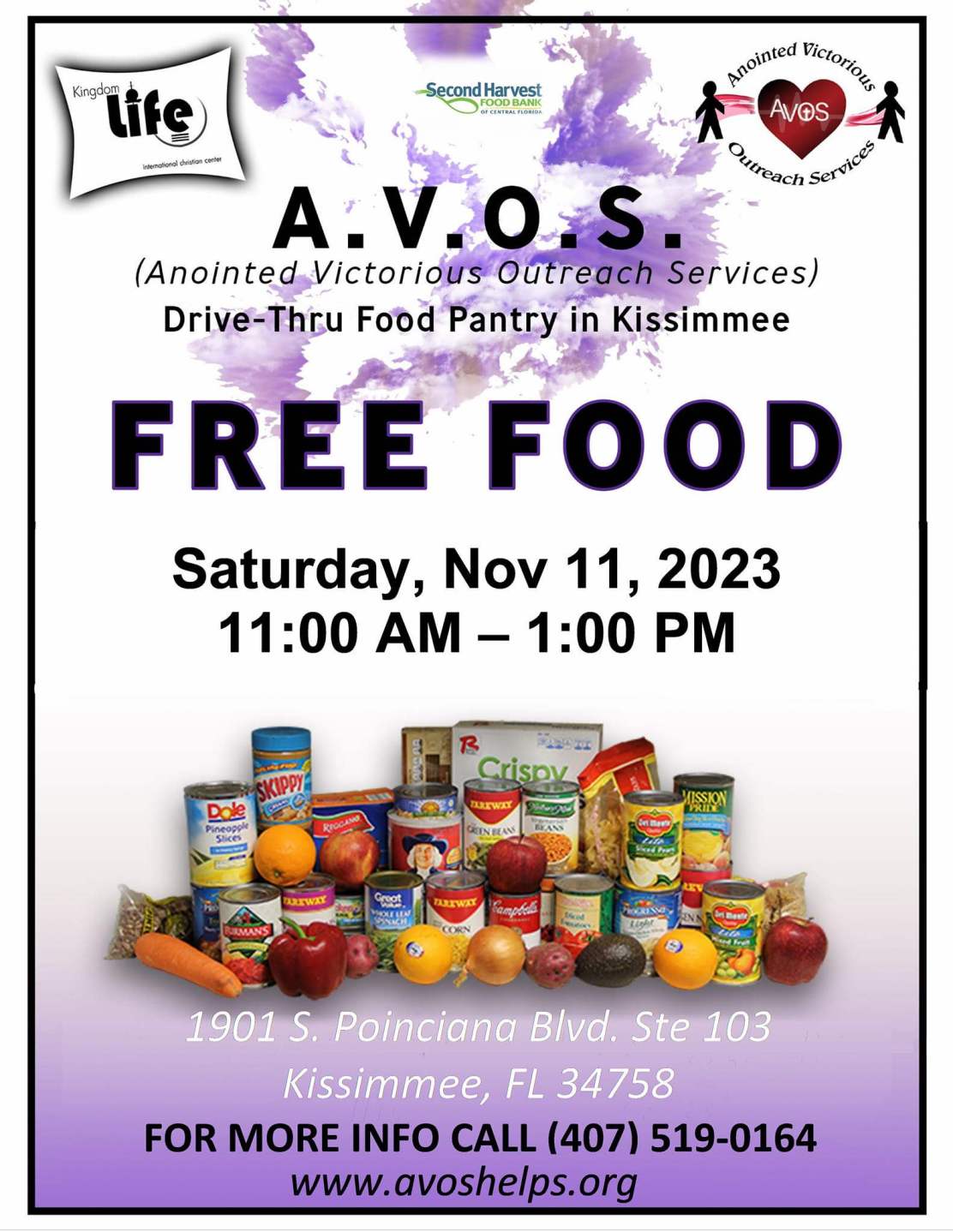 Located at 1901 South Poinciana boulevard, it is very close to everyone in Poinciana. AVOS is a 501-C3 non-profit food pantry located in Kissimmee, Florida. It was established in 2019 with a desire to serve the community by supplying free food and toiletries for families in need. They provide many free food events throughout the year for the community.