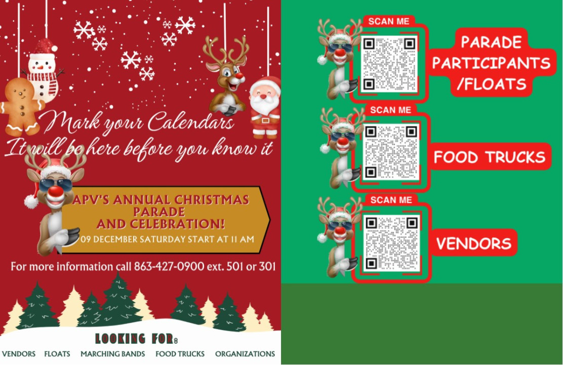 At 9 am on Saturday, December 9th APV will be hosting its annual Christmas Parade and Celebration. Follow the links below to register your parade participant, float, food truck, or vendor spot.