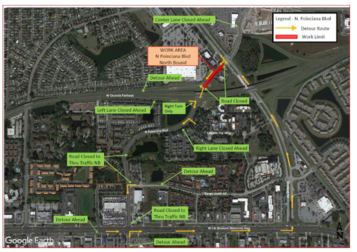 A section of Poinciana Boulevard will be closing soon. This could have a major impact if you commute to Orlando. Construction will take place on N. Poinciana Boulevard and S. Osceola Parkway. Detours signs are posted for northbound Poinciana Boulevard. Plans are to replace old gravity sewer lines, as well as, manholes on the outside lane of the roadway. Toho Water Authority and Osceola County are involved with this project. Construction is scheduled to last approximately 2 weeks and wrap up on October 17th.