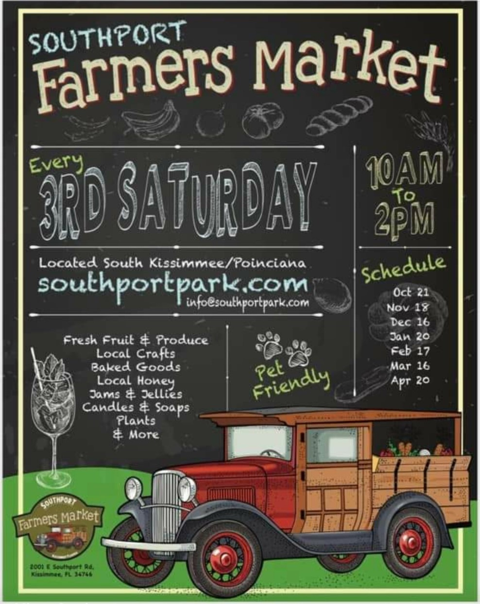 Looking for a fresh and local option to restock your kitchen? Starting on Saturday October 21st, and continuing every 3rd Saturday until April, Southport will be hosting a farmer's market. The event will run from 10am til 2pm. Featuring fresh local fruit, veggies, baked goods, jams, jellies, crafts, and more. The market is kid and pet friendly, so bring the whole family out. Located a short 10 min drive down Southport Road, this one is not far away from the heart of Ptown. Come out and support our local Poinciana businesses. You can check out their website here, or view their Facebook page here.